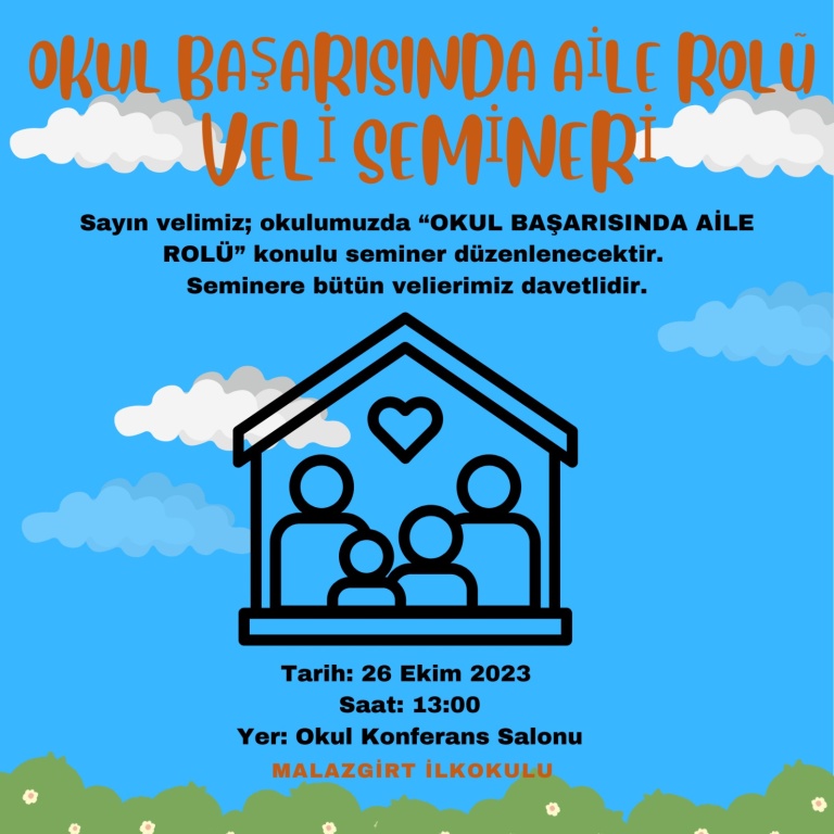Sayın velimiz, 26 Ekim 2023 Perşembe günü saat 13.00'te okulumuz konferans salonunda "Okul Başarısında Aile Rolü" konulu seminer düzenlenecektir.Seminere bütün velilerimiz davetlidir.